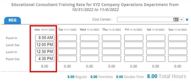 - Fill in the timecard with all clock-in, clock-out, lunch clock-in and out times, etc. As a reminder, please ensure you are taking and entering all meal breaks required by law, if applicable.