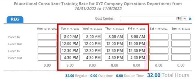 - *Cost Centers Required: If you are required to include a cost center on your timecard, select the cost center from the drop down on the top right corner of the timecard. To submit hours for multiple cost centers in one week, submit 1 timecard per cost center.