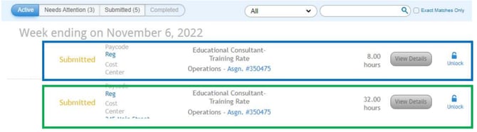 - Submit this timecard at the end of the week. In this example, you have two timecards. 1 for the end of October, and 1 for the start of November.