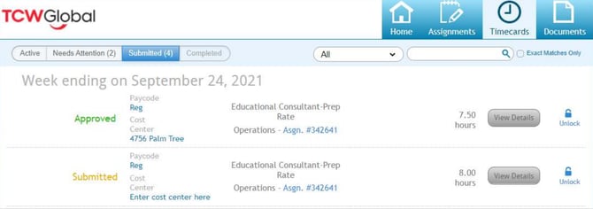 - Timecard Status: You can check the status by visiting the Timecards Tab