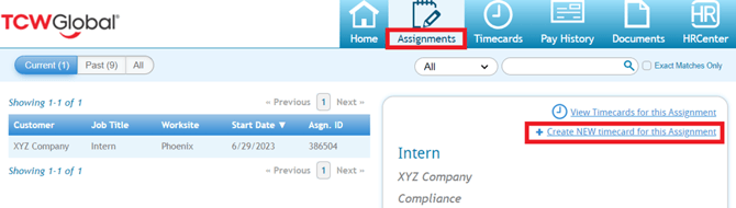 - Click on the Assignments tab and select Create New Timecard for this Assignment.